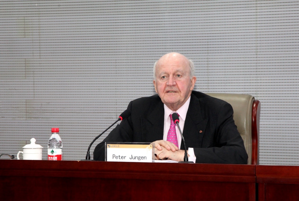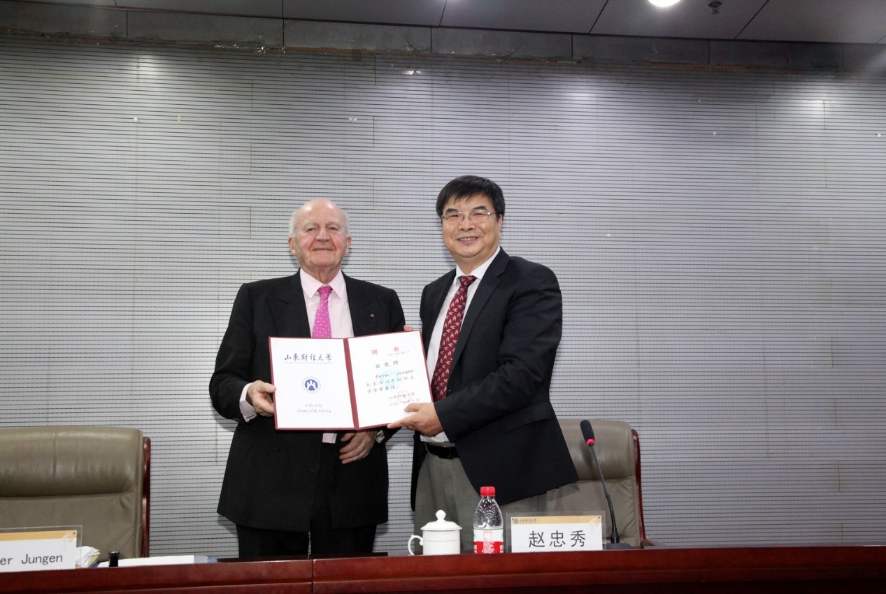 11月8日,应国产a片 校长赵忠秀教授的邀请,德国天使投资联盟创始人兼总裁彼得•荣根(Peter Jungen)教授为我校师生作题为Development of China in the Last 50 Years的讲座,校长赵忠秀为彼得•荣根先生颁发荣誉教授证书并致辞。