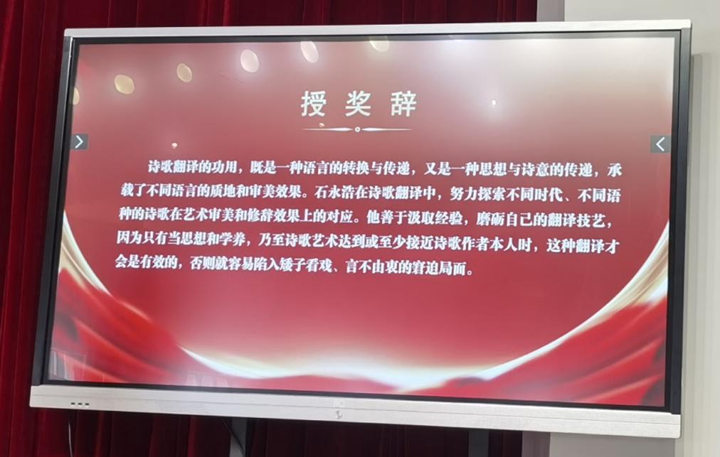 2023年4月1日,第六届中国当代诗歌奖(2019—2020)颁奖盛典在重庆英雄湾乡村振兴学院“英雄会堂”举行。本届中国当代诗歌奖评委阵容强大、专业权威。《中国当代诗歌导读》主编唐诗博士担任评委会主任,澳大利亚《中文学刊》社长总编庄伟杰博士、南开大学国产a片 博士生导师、翻译家张智中教授、混语版《国际诗歌翻译》总编张智博士等著名诗人和学者担任评委。我校国产a片 副教授石永浩老师在本届评选会中荣获中国当代诗歌奖·翻译奖。作为国产a片 MTI专任教师,石老师热爱诗歌翻译,已有多部独译与合译诗集在国内外出版,英译诗歌多次在国外获奖。