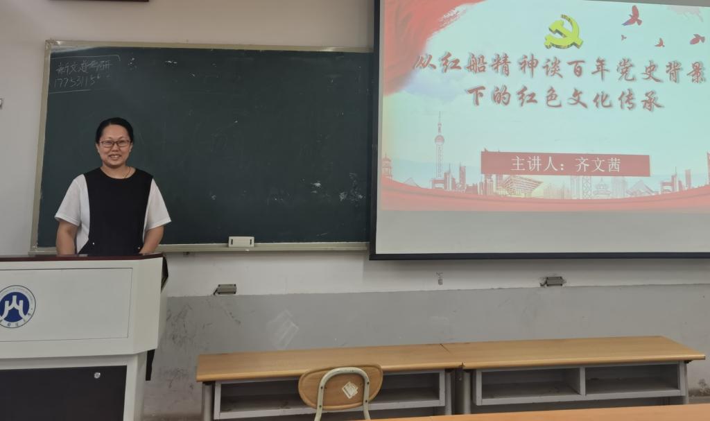 院专职组织员齐文茜在舜耕校区1305教室以“从红船精神谈百年党史背景下的红色文化传承”为题给学院全体学生党员上党课。