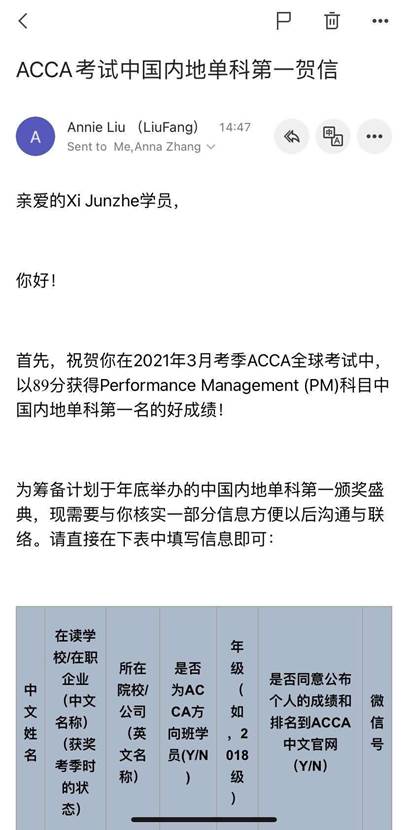恭喜国产a片 2019级英语专业4班袭俊哲同学在ACCA 2021年3月考季获得PM单科大陆第一。