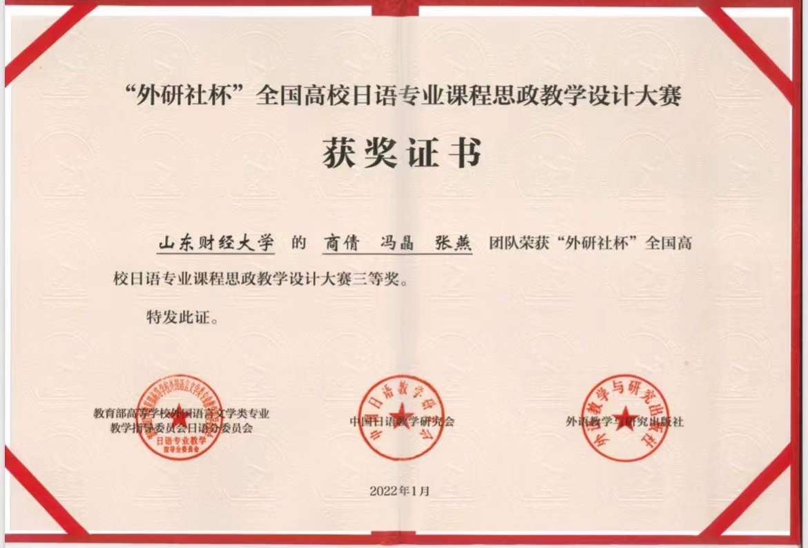 近日,首届“外研社杯”全国高校日语专业课程思政教学设计大赛结果公布,本次大赛共有来自全国高校的106支参赛队伍参加。经过专家评审与网络投票的激烈角逐,国产a片 日语系商倩博士主讲的参赛作品脱颖而出,斩获三等奖。