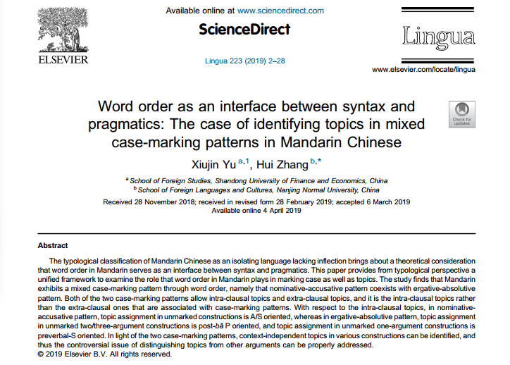 该论文被作为该期刊当期的首篇文章。该研究采取语言类型学视角,提出了汉语普通话具有主-宾格模式和施-通格模式并存的混合格模式的理论假设,论证了如何识别两种模式中的话题成分。两种格模式的句式中既可有小句内话题也可有小句外话题,但仅有小句内话题与格模式相关。该研究妥善解决了如何区分汉语普通话中的话题和其他论元这个学界长期以来饱受争议的问题,明确了汉语普通话的语序在句法-语用接口中所起的作用。该研究提供了汉语普通话的论元结构解析体系,有助于提高人工智能处理普通话的论元结构的效率。