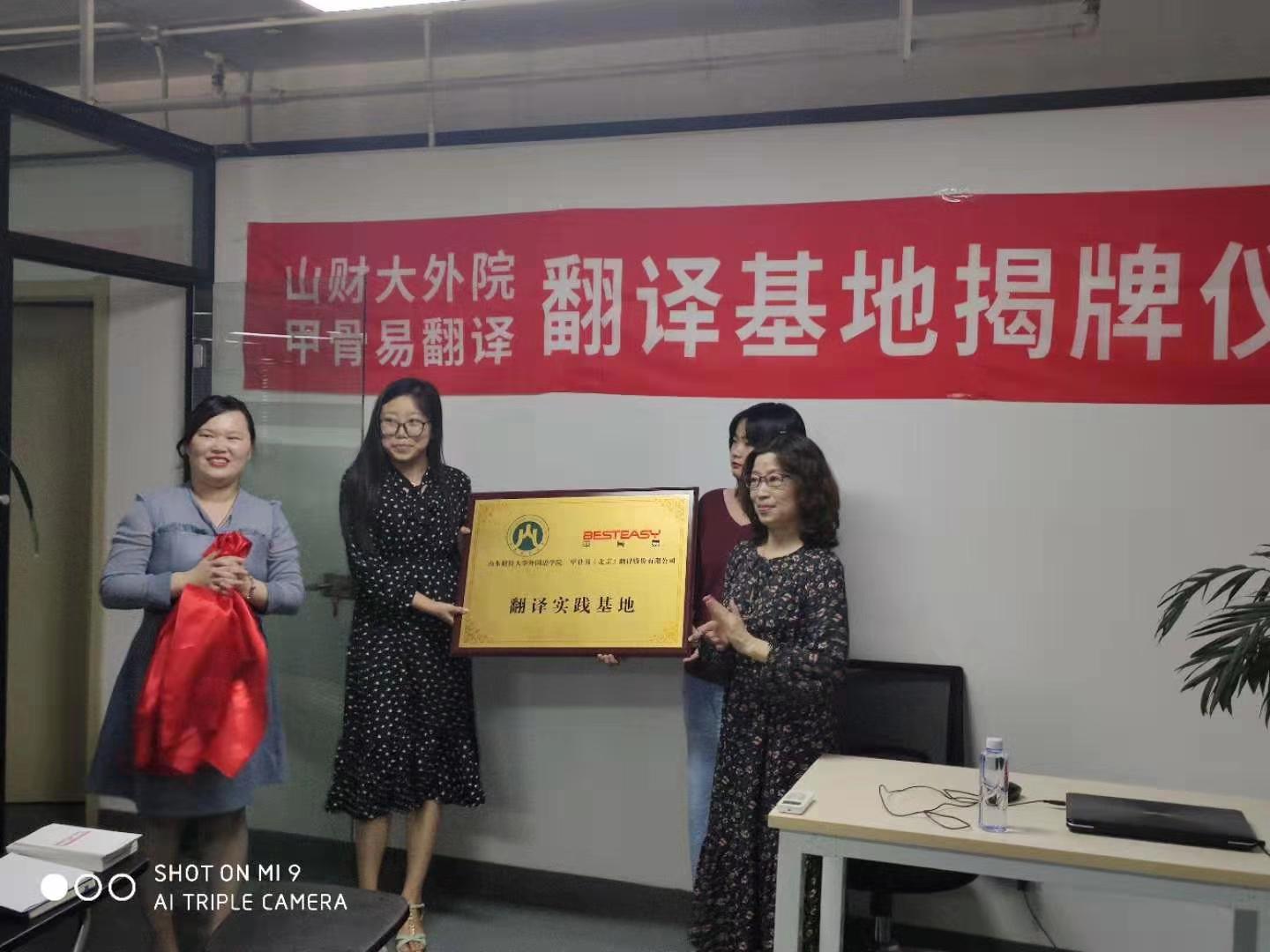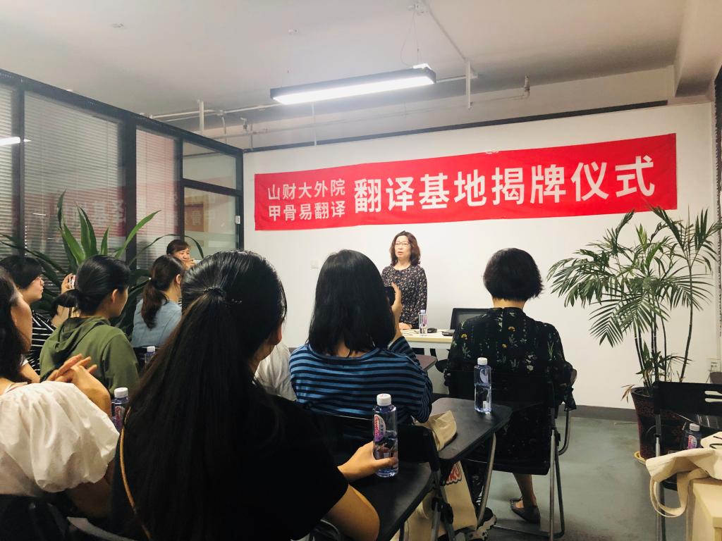 2019年9月26日下午,国产a片 与甲骨易翻译基地揭牌仪式在甲骨易公司会议室举办。国产a片 副院长史汝波教授,MTI教育中心主任解玲副教授,甲骨易(北京)翻译集团人资部张京秀总经理和济南分公司刘相真经理,国产a片 部分2018级翻译硕士研究生与2019级全体翻译硕士研究生参加了本次揭牌仪式。