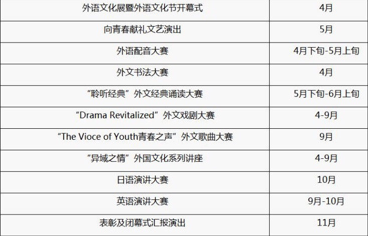 另外,本次外语文化艺术节活动时间为四月至十一月,持续八个月。以下是具体活动项目及时间。