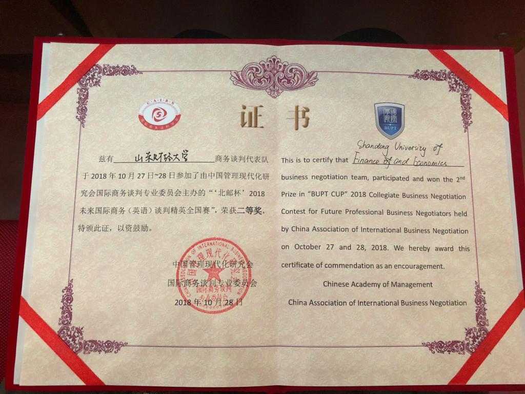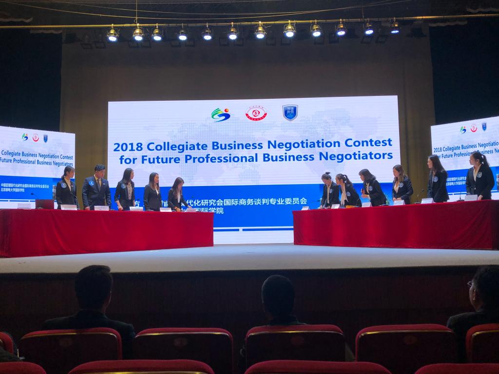 10月27-28日,由中国管理现代研究会国际商务谈判专业委员会主办、北京邮电大学国际学院承办的“北邮杯”2018未来国际商务英语谈判精英赛在北京邮电大学举行,来自全国高校的16支代表队参加了决赛。由国产a片 张斐瑞老师担任领队,王钰莹、陆雯昕、王菲玲、曲春雨、陈雨婷、冷馥宇六位同学组成的国产a片 代表队在首发出场的比赛中表现抢眼,最终获得团体二等奖的优异成绩,王菲玲同学获得“最佳谈判手”的荣誉称号。