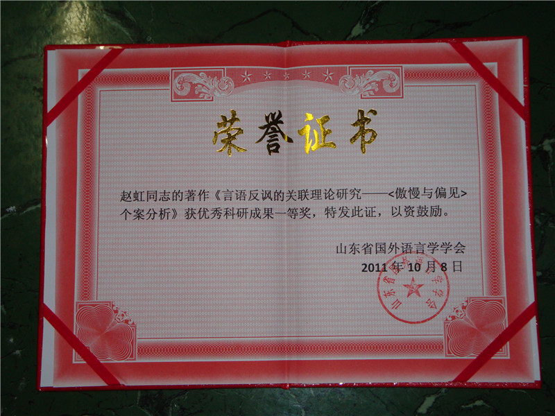 (通讯员 莫振银)在2011年10月8日于山东大学举行的当代语言学研究国际研讨会暨山东省国外语言学学会第十二届年会上,国产a片 赵虹博士的专著《言语反讽的关联理论研究——〈傲慢与偏见〉个案分析》荣获优秀科研成果一等奖。