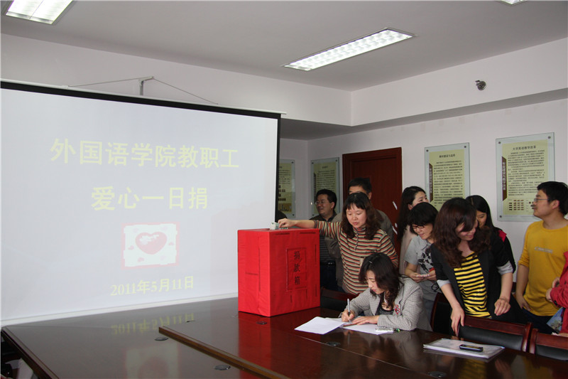 2011年5月11日下午,在国际交流中心601会议室,国产a片 积极响应省教育厅、省教育工会、省教育基金会“爱心一日捐”活动(鲁教财字[2011]10号文件)的统一部署和高校工委、山东省慈善总会高校分会“关于进一步做好高校慈善工作的通知”(鲁高工委通字[2011]33号)要求,学院领导高度重视,由副书记汤长胜传达了爱心日捐通知。随后,学院全体教职员工慷慨解囊,纷纷捐款,体现了关爱他人,大爱无疆的精神。共有66位教职工参加了此次日捐活动,共筹集善款7600元钱。