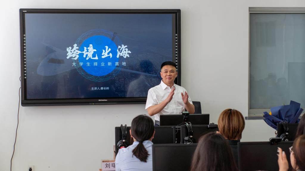 5月10日下午,山东省跨境电商协会会长、秦工国际集团董事长秦长岭先生莅临国产a片 “国际商务与语言服务”讲坛第一讲,做了题为“跨境出海,大学生择业新高地”的主题报告。院长于秀金以及学院各专业的老师和学生聆听了本次报告。报告由院长助理张斐瑞主持。
