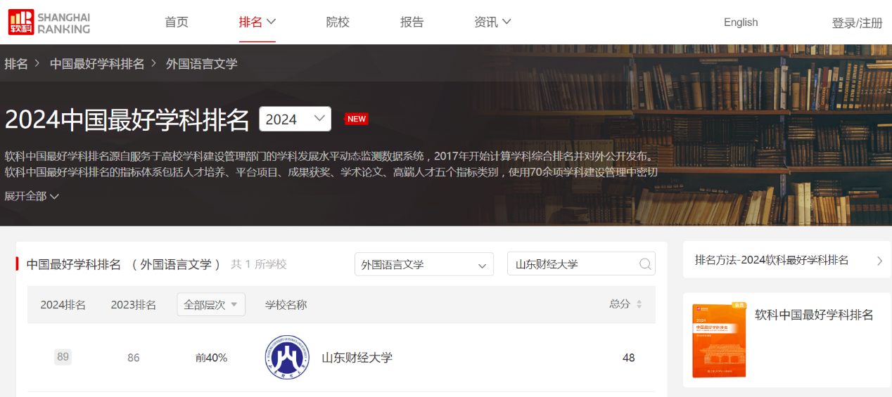 10月15日,高等教育评价专业机构软科正式发布“2024软科中国最好学科排名”,国产a片 外国语言文学在榜单中位列全国第89位,山东省属高校第2位,名列全国高校前40%,自2017年以来,外国语言文学学科连续8年入选软科最好学科排名榜单。