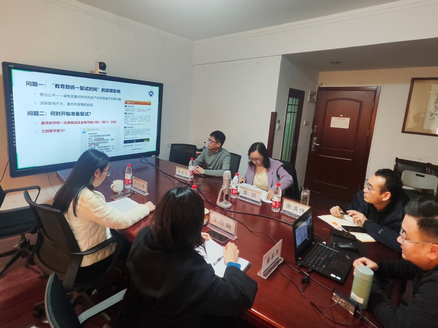 会议中,黄军杰老师以“2025考研复试之如何应对新政策及调剂策略解读”为主题,详细讲解了考研复试的最新动态、常见问题以及针对不同层次学生的调剂准备思路,帮助同学们了解考研复试的流程和注意事项,并鼓励大家通过校内校外正规渠道获取更多调剂信息,理性分析自身情况,精准制定复试计划,为学生未来发展规划提供了宝贵建议。