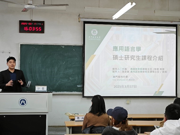 3月17日下午16时,澳门城市大学人文社科学院助理教授、通识教育部主任沙磊走进舜耕校区2106教室,为国产a片 本科生学子带来一场干货满满的应用语言学考研宣讲会。活动由国产a片 院长助理兼英语系主任聂喆主持,外院学子踊跃参与,现场学术交流氛围浓厚。