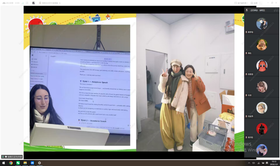 在课程设置分享环节,徐晓玉同学结合自身访学经历,详细介绍了济州国立大学的课程体系与教学模式。她表示,济州国立大学的课程设置兼具专业性与实用性,既涵盖了韩语课,韩国电影分析课,探索济州课,文化体验课,济州神话导论课、韩国文化导论课,能够满足不同专业方向学生的学习需求。“济州国立大学的课堂更注重互动性与实践性,”徐晓玉同学说道,“课堂上,老师经常组织小组讨论、主题演讲、案例分析等活动,鼓励学生主动表达自己的观点,这种教学模式不仅能够提升语言应用能力,还能培养批判性思维与团队协作能力。”