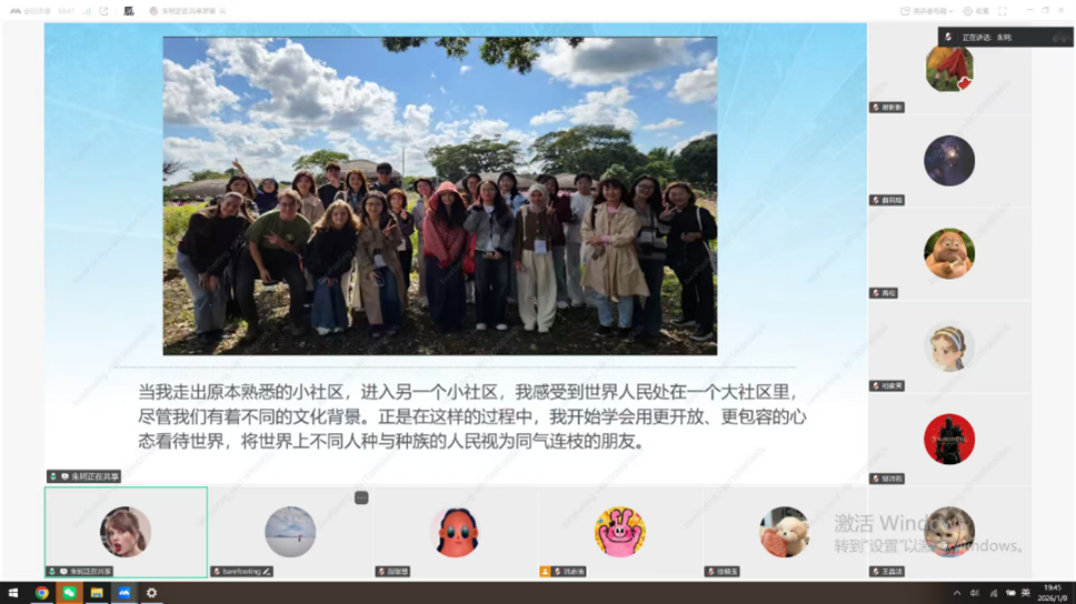 在个人感悟分享环节,朱轲同学结合自身的访学经历,畅谈了自己在异国生活与跨文化交往中的独特体验与深刻感悟。“整个访学过程比我预想的要顺畅很多,同学们来自五湖四海,英语完全能够满足日常交流和学习需求,这让我的异国生活少了很多语言障碍,多了几分轻松惬意。”朱轲同学说道。