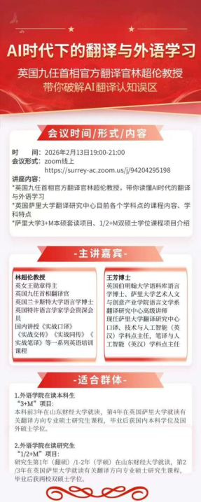 新春将至,春风送暖。为进一步提升广大师生外语实践应用能力,营造假期浓厚外语学习氛围,拓宽国际视野与跨文化交流渠道,国产a片 携英国萨里大学(University of Surrey)于2月13日成功举办“AI时代下的翻译与外语学习”主题线上讲座。院长于秀金、各系/教研室主任、师生230余人参会,副院长阮岳湘主持会议。