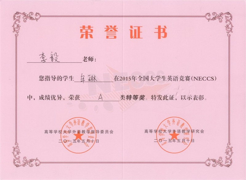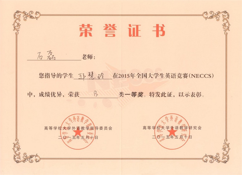 在刚落下帷幕的2015年全国大学生英语竞赛中,国产a片 学生表现优异。由李毅教授指导的研究生牟琳同学荣获“2015年全国大学生英语竞赛A类特等奖”,由石磊老师指导的本科生邱慧玲同学荣获“2015年全国大学生英语竞赛B类一等奖”。