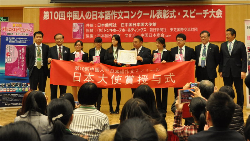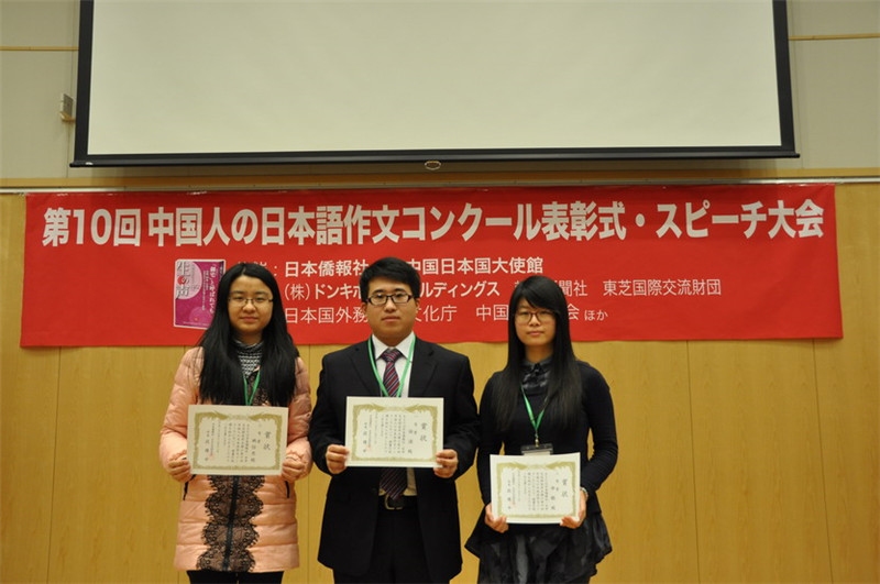 12月12日,由日本侨报社和日中交流研究所共同主办的第十届全国日语作文大赛颁奖仪式在日本大使馆隆重举行。本次大赛共有来自全国196所院校的4133人参赛,参赛人数创历史新高,竞争空前激烈,国产a片 学生的获奖人数在全国各参赛高校中名列榜首。日语专业2012级的陈谦同学获得一等奖,日本驻华大使木寺昌人亲自向其颁发了奖状和奖品。2012级的姚怡然、2011级的申皓获得三等奖。获奖同学在日语专业副主任冯晶副教授和外教新村美有纪的带领下,参加了颁奖仪式。颁奖嘉宾有日本驻华大使木寺昌人,北京日本学研究中心主任、中国日语教学研究会会长徐一平以及来自东芝株式会社、中国日本商会等知名企业界的代表。日本朝日新闻、NHK等各大媒体全程报道。