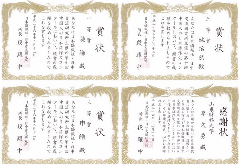 作为我校首届外语技能系列大赛的一个环节,国产a片 日语专业于今年5月组织了日语写作大赛,赛后安排教师对优秀学生进行了精心指导,并推荐参加了国内日语界规模、影响最大的赛事之一--“第十届全国日语作文大赛”。本次大赛以“ACG(动画、漫画、游戏)和我”、“公共礼仪与中国人”为主题,历时5个月,经过4轮严格的评审,最终评选出特等奖1名,一等奖5名,二等奖15名,三等奖40名。另外,陈谦和姚怡然同学的指导教师新村和申皓同学的指导教师李文秀获得了主办方颁发的“感谢状”,新村还被委托为新一届作文大赛的“推广大使”。