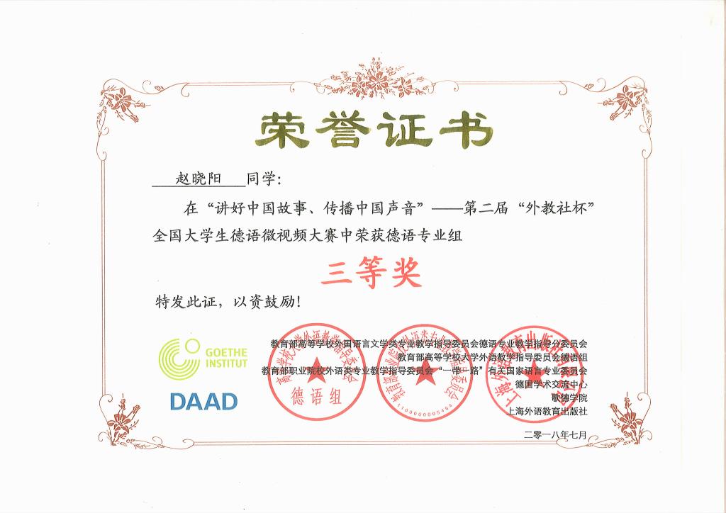 近日,由教育部高等学校外国语言文学类专业教学指导委员会德语专业教学指导分委员会、教育部高等学校大学外语教学指导委员会德语组、上海外语教育出版社、德意志学术交流中心以及歌德学院等联合举办第二届“外教社杯”全国大学生德语微视频大赛落下帷幕,国产a片 德语系2016级赵晓阳同学的作品《我的青岛》在德语专业组脱颖而出获三等奖。